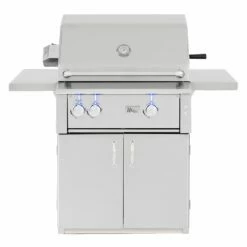 The 30-inch Alturi also features a unique Flame Thrower Ignition that shoots a burst of flame to ignite the main burners and is much more reliable than traditional spark ignition systems. The double lined, spring assisted hood keeps hot air in to ensure a consistent grilling environment complete with a built in 3-inch temperature gauge and interior halogen lighting with LED front panel lighting. In addition, the 11,000 BTU infrared back burner offers a high quality rotisserie burner for professional style rotisserie cooking and includes a storage bracket for the rotisserie spit when not in use. The stainless steel grill cart features double door storage with an integrated condiment tray, adjustable shelves, and locking casters for a high quality stand alone grill option.
