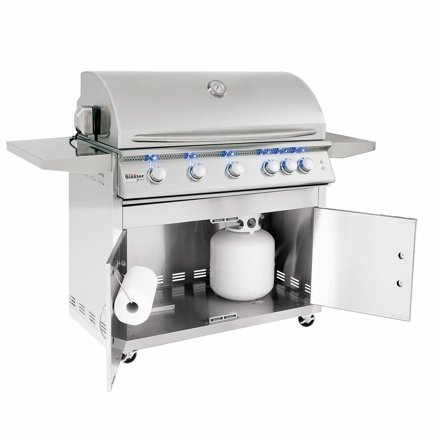 The 40-inch Sizzler Pro offers a signature Flame Thrower Ignition that uses a burst of flame to ignite the main burners more reliably than a traditional spark system. The hood is fitted with a temperature gauge for easy monitoring and is built in a two-layer, insulated style to keep heat where it belongs, giving you a consistent cooking environment. Interior lights and LED enhancements offer exceptional ease of use in low-light conditions. As an added perk, it features a 15,000 BTU infrared back burner for professional-quality rotisserie cooking. The ready-to-assemble stainless steel grill cart offers double door storage, fixed shelves, and high quality locking casters to provide a terrific standalone grill option.