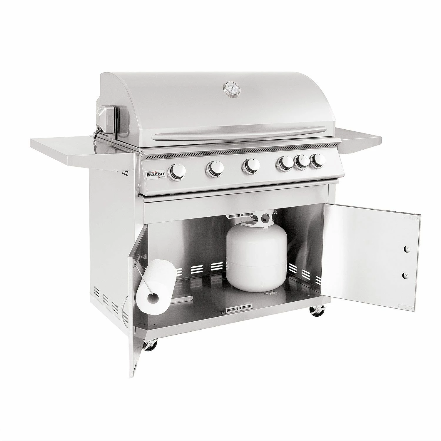 The 40-inch Sizzler also features a unique Flame Thrower Ignition that shoots a burst of flame to ignite the main burners and is much more reliable than traditional spark ignition systems. The insulated and double lined hood keeps hot air in to ensure a consistent grilling environment complete with a built in 3-inch temperature gauge to accurately monitor your grilling temperature. In addition, the 15,000 BTU infrared back burner offers a high quality rotisserie burner for professional style rotisserie cooking. The stainless steel grill cart features double door storage, fixed shelves, and high quality locking casters to provide a terrific stand alone grill option.