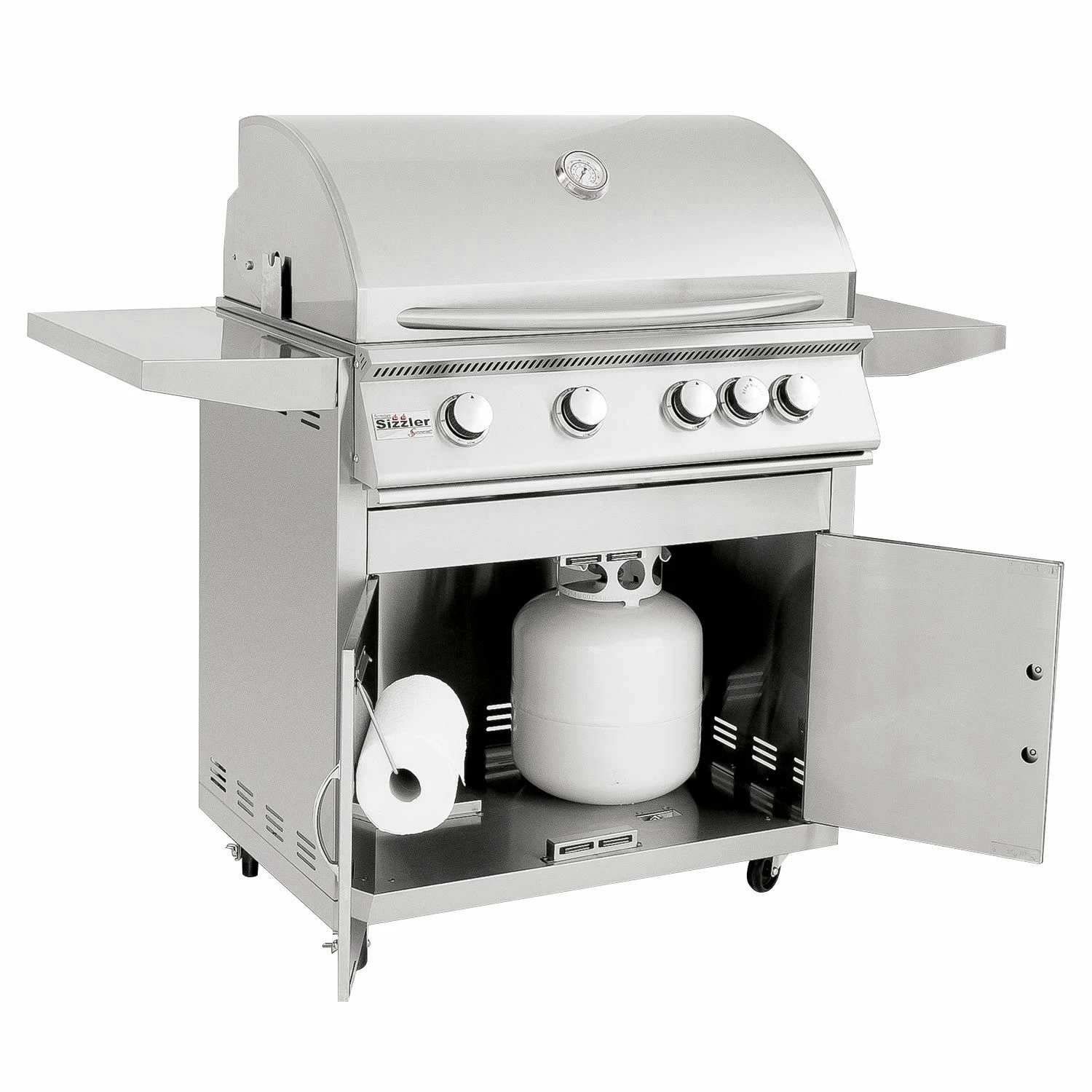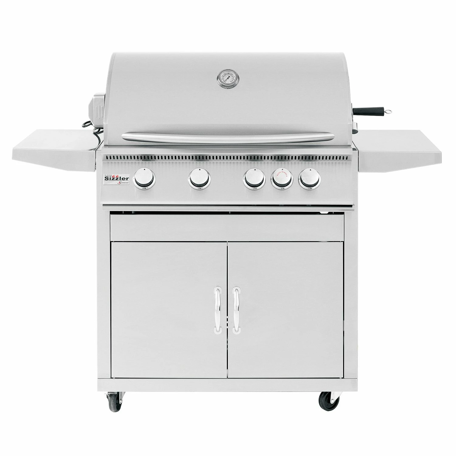 The 32-inch Sizzler also features a unique Flame Thrower Ignition that shoots a burst of flame to ignite the main burners and is much more reliable than traditional spark ignition systems. The insulated and double lined hood keeps hot air in to ensure a consistent grilling environment complete with a built in 3-inch temperature gauge to accurately monitor your grilling temperature. In addition, the 15,000 BTU infrared back burner offers a high quality rotisserie burner for professional style rotisserie cooking. The stainless steel grill cart features double door storage, fixed shelves, and high quality locking casters to provide a terrific stand alone grill option.