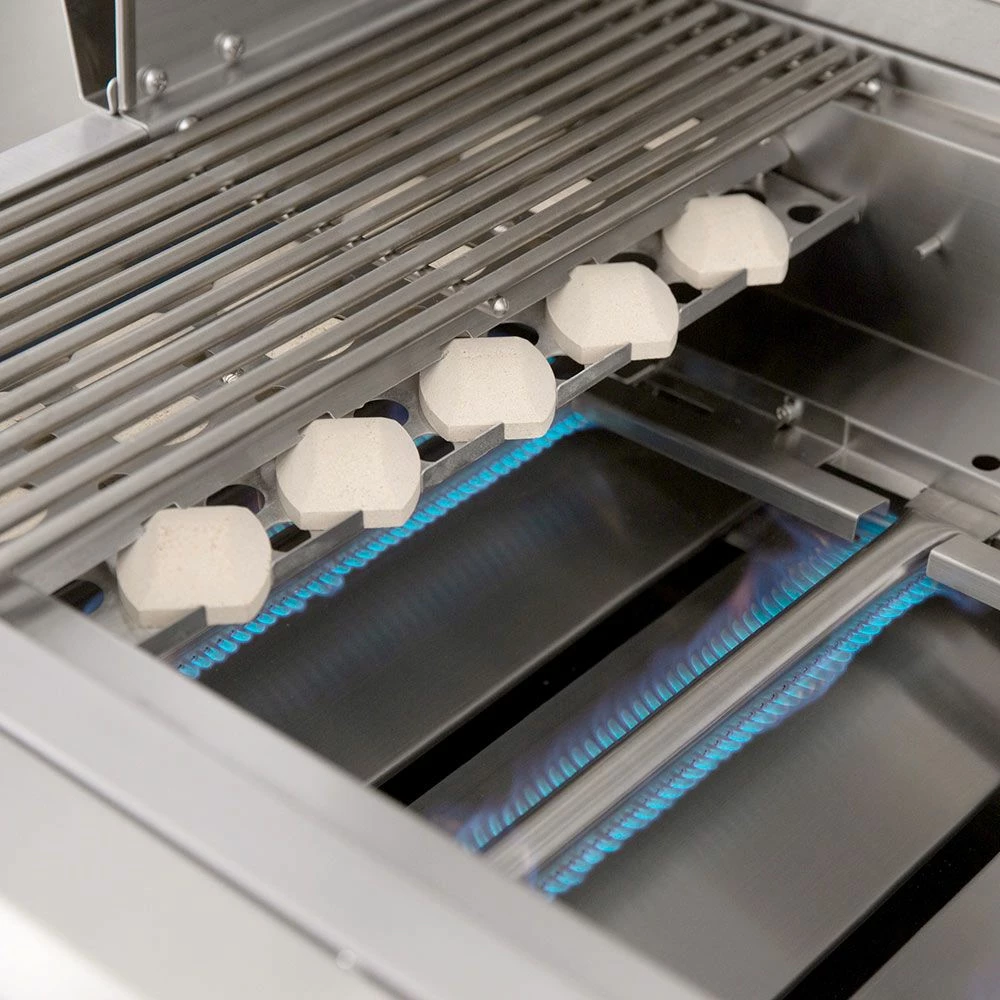 - Captured Briquette Trays – Unique ceramic briquettes sit above the burner to provide radiant heat and eliminate hot/cold zones across the 740in² cooking surface