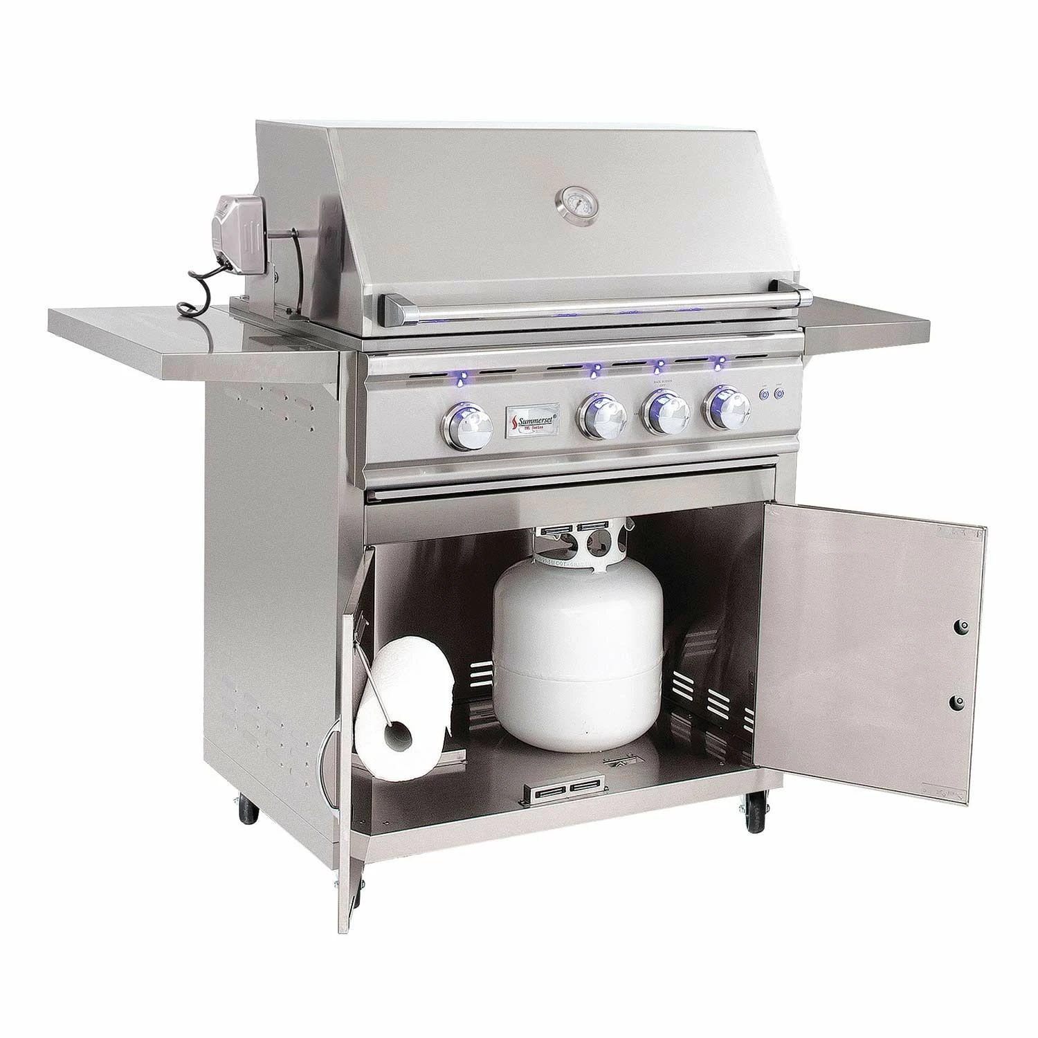 Summerset TRL32 TRL Series Gas Grill On Cart, 32-Inch combines superior quality and high performance to provide a terrific option to complete your outdoor kitchen. The grill features a solid 304 stainless steel construction to ensure durability and longevity while each of the (3) heavy duty U-Tube burners are rated for 18,000 BTU to provide high heat to the unique captured briquette trays. The captured briquette trays provide even radiant heat across the 855in² cooking surface and eliminate hot and cold zones as the 8mm thick stainless steel grates offer a thick gauge grilling surface for professional style grill marks.