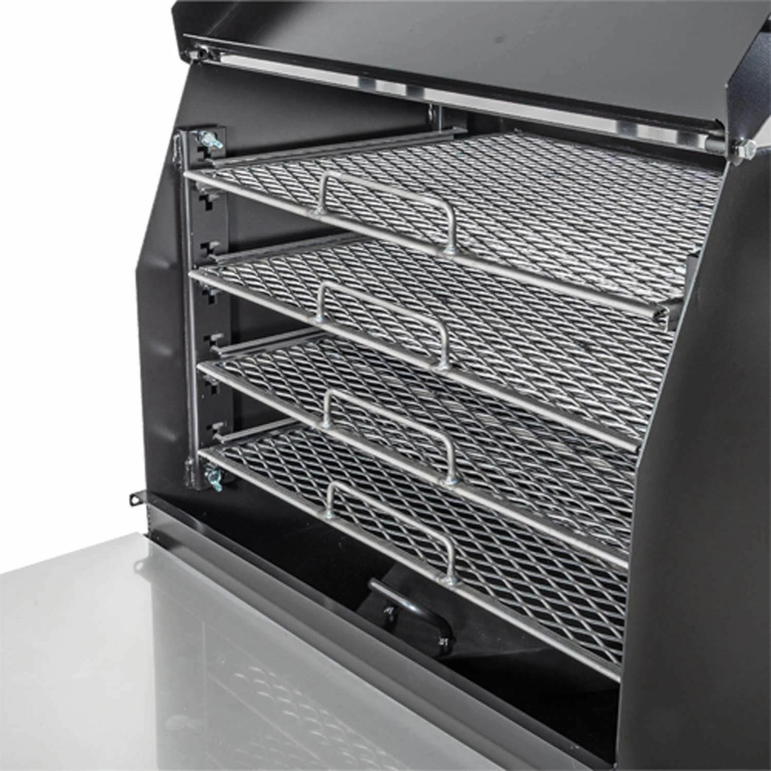 - Smoking Shelves – (4) Adjustable, locking smoking shelves allow for large amounts of food to be smoked at one time