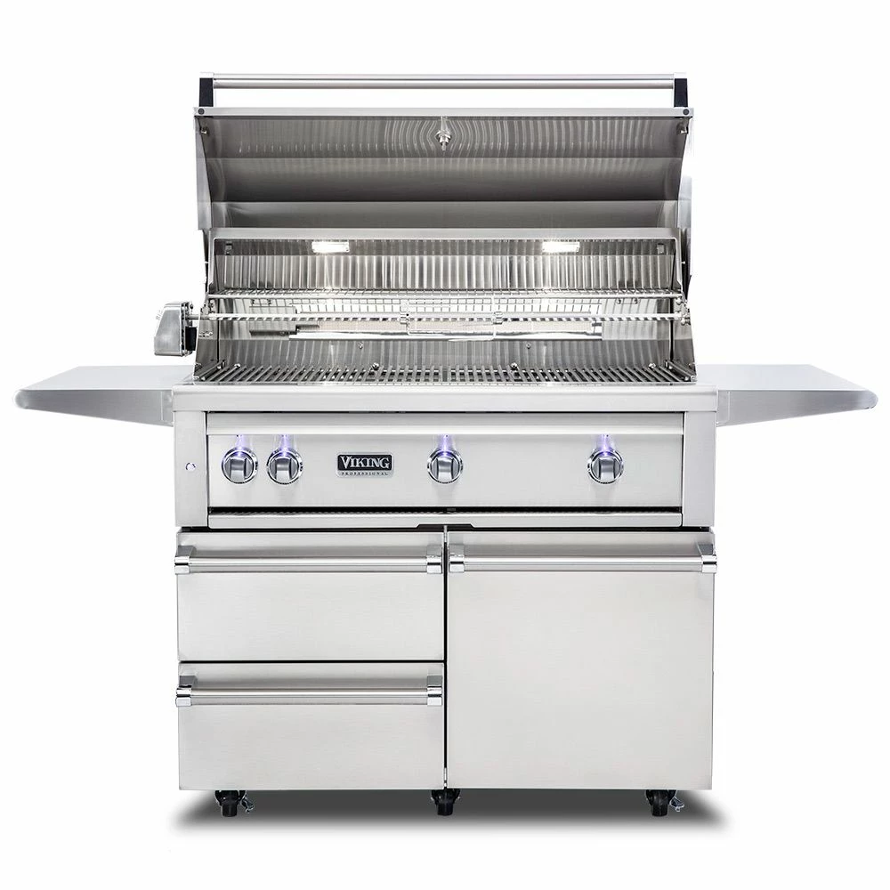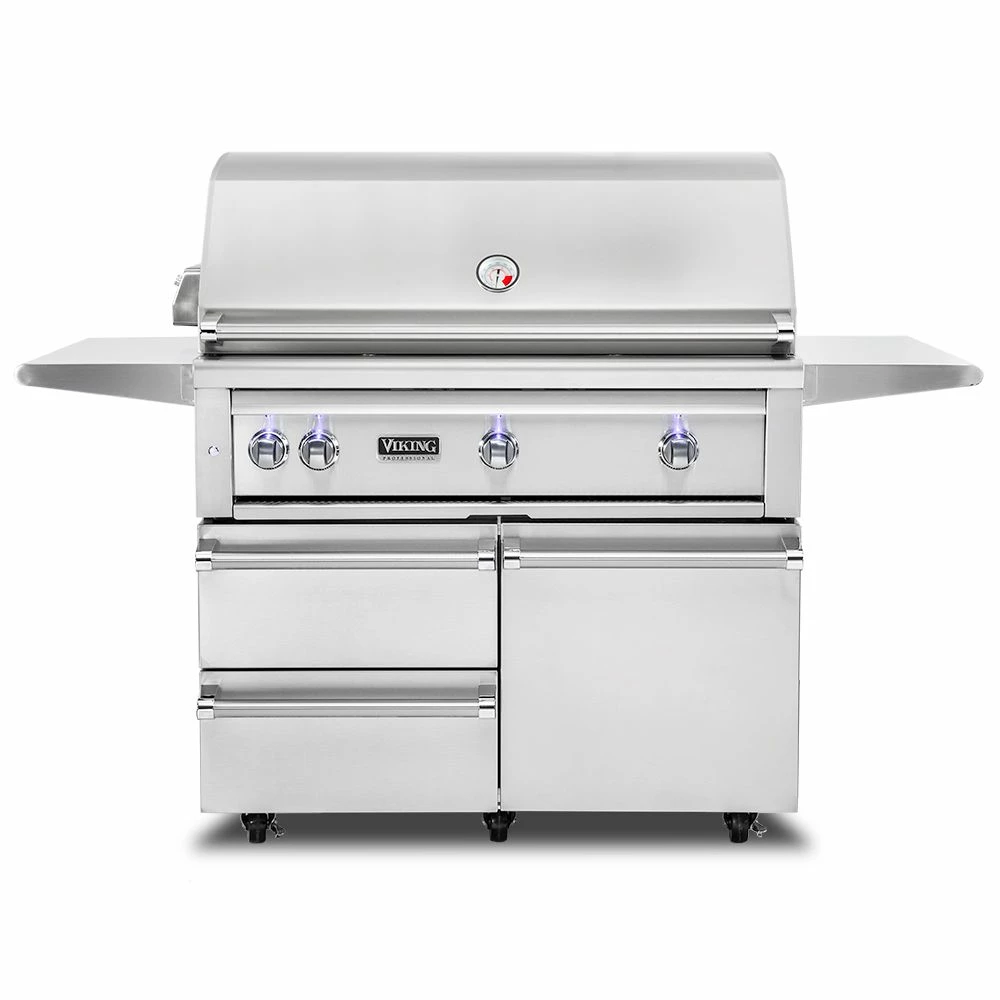 Viking 5 Series Stainless Steel Cart Gas Grill with ProSear Burner & Rotisserie, 42-Inch (VQGFS542) offers a top-of-the-line experience for the grill master who is serious about performance and quality, built from 16-gauge stainless steel to last through the years. It features (2) commercial grade cast brass burners which put out 25,000 BTU each and an infrared ProSear burner for achieving excellent color and flavor every time. As if that weren’t enough, it also comes outfitted with a dedicated infrared rear burner and heavy-duty rotisserie kit with a 3-speed motor for even more versatility. Combine all of this with the high-density ceramic briquettes providing even and reliable radiant heat across the 1200in² grilling surface and you’ve got a grill that produces delicious results that are sure to impress.