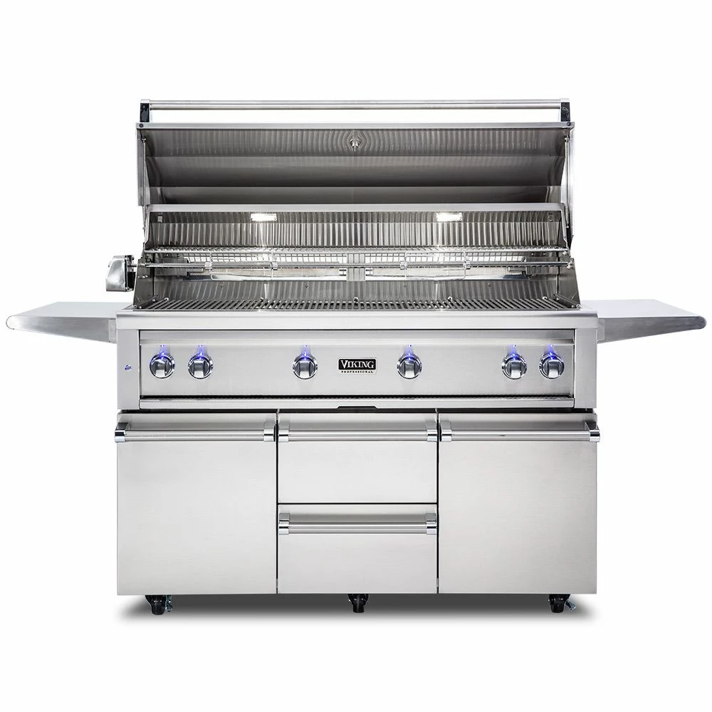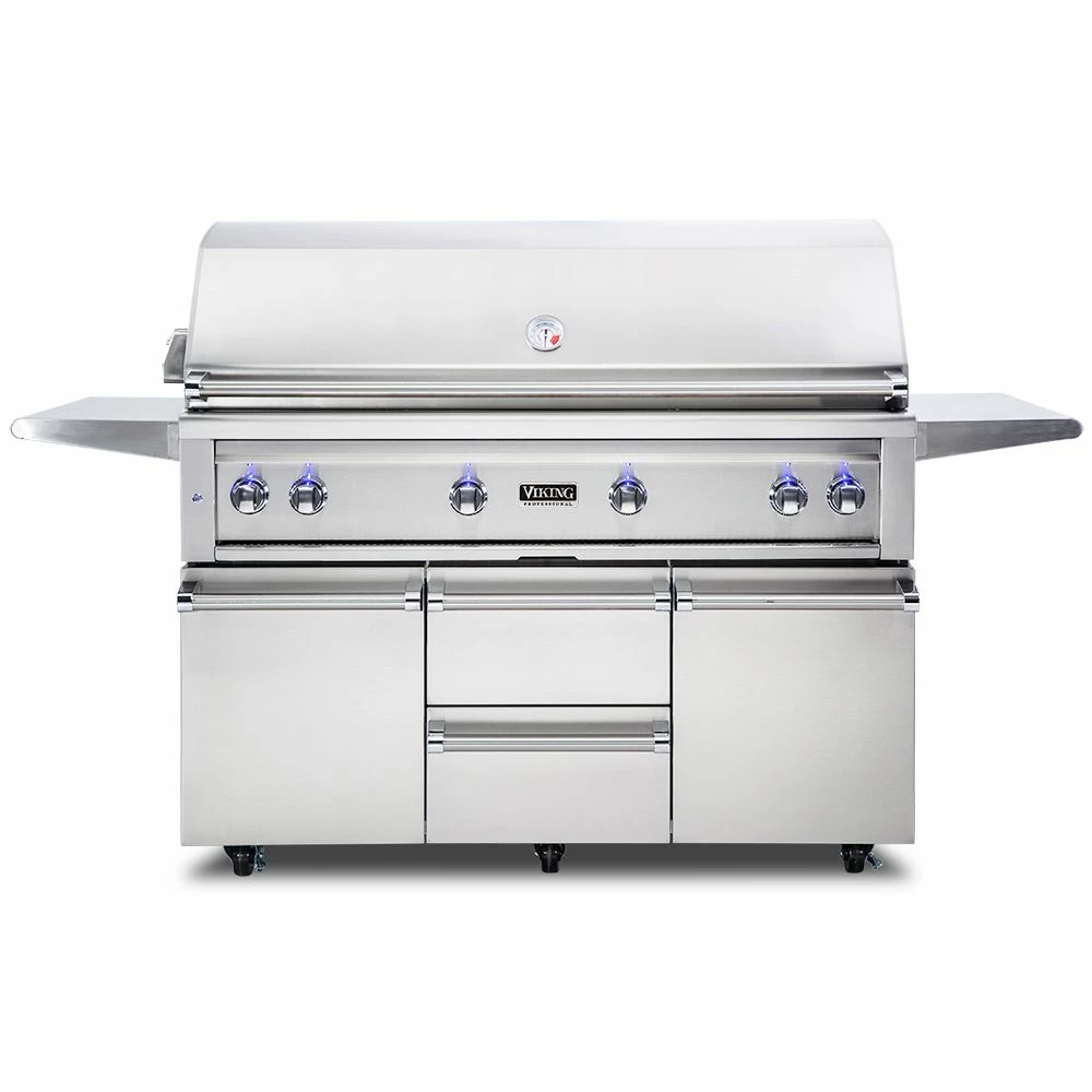 Viking 5 Series Stainless Steel Cart Gas Grill with ProSear Burner & Rotisserie, 54-Inch (VQGFS554) offers a top-of-the-line experience for the grill master who is serious about performance and quality, built from 16-gauge stainless steel to last through the years. It features (3) commercial grade cast brass burners which put out 25,000 BTU each and an infrared ProSear burner for achieving excellent color and flavor every time. As if that weren’t enough, it also comes outfitted with a dedicated infrared rear burner and heavy-duty rotisserie kit with a 3-speed motor for even more versatility. Combine all of this with the high-density ceramic briquettes providing even and reliable radiant heat across the 1200in² grilling surface and you’ve got a grill that produces delicious results that are sure to impress.