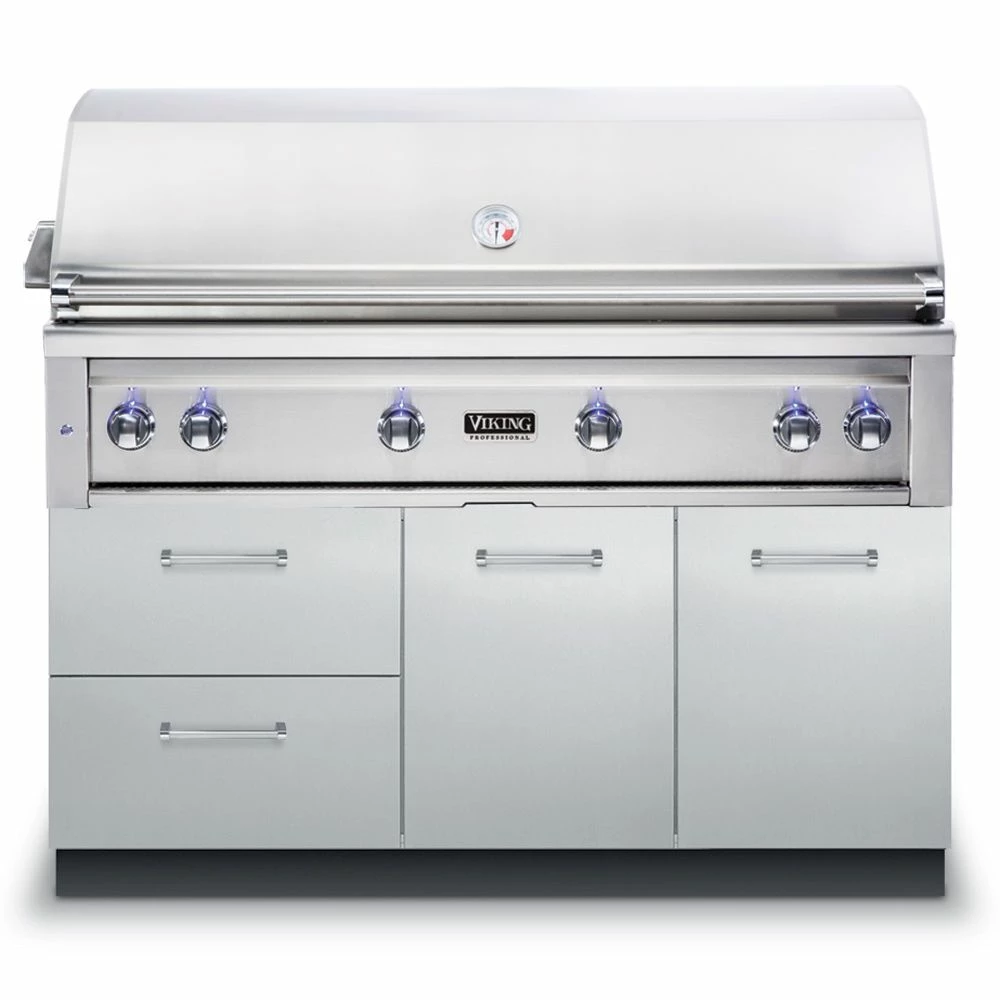 Viking 5 Series Stainless Steel Gas Grill on Stainless Steel Grill Base with ProSear Burner & Rotisserie, 54-Inch (VQGI554BSS) offers a top-of-the-line experience for the grill master who is serious about performance and quality, built from 16-gauge stainless steel to last through the years. It features (3) commercial grade cast brass burners which put out 25,000 BTU each and an infrared ProSear burner for achieving excellent color and flavor every time. As if that weren’t enough, it also comes outfitted with a dedicated infrared rear burner and heavy-duty rotisserie kit with a 3-speed motor for even more versatility. Combine all of this with the high-density ceramic briquettes providing even and reliable radiant heat across the 1200in² grilling surface and you’ve got a grill that produces delicious results that are sure to impress.