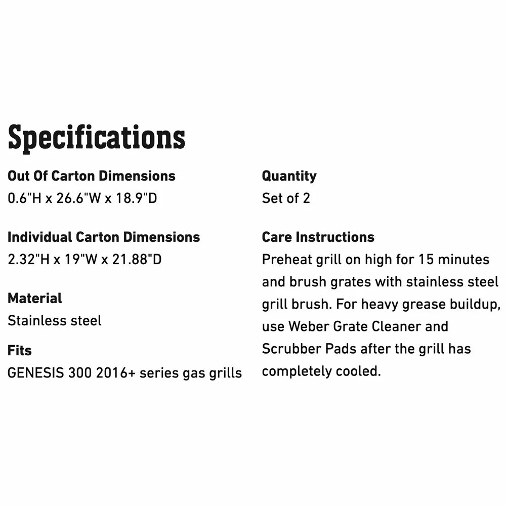 Weber Crafted Stainless Steel Grates for Genesis 300 Series Grills (WEB-7852) offers an excellent upgrade to help you get the most out of your Weber grill. This innovative platform is designed to replace the standard grill grates and allow the use of the entire list of accessories from the Weber Crafted Outdoor Kitchen Collection, including things like flat top griddles, a wok/steamer combo and a skewer set (sold separately)