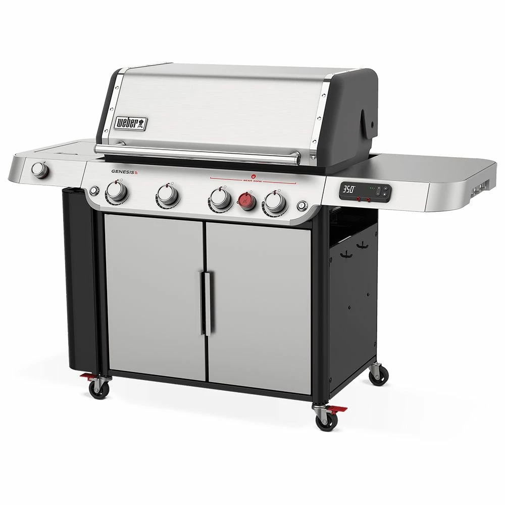 Weber Genesis Smart 4-Burner Freestanding Gas Grill with Sear Burner and Side Burner (WEB-SPX-435) offers an upgraded grilling experience with modern convenience and tech features that are designed to make it a breeze to get great results every time. This gas grill features high performance PureBlu burners and Weber’s largest and hottest sear zone, allowing you to get those deep, rich grill marks that everyone craves. It also boasts a smart side burner, giving you more space to work your magic, and an improved grease management system that makes clean-up a snap. On top of all of that, it also gets all the fundamentals right as well. It features a surprisingly sizeable grilling area augmented with an expandable upper grate for even more flexibility, whether you’re toasting buns or just keeping things warm until dinner time. Finally, it also includes a side mounted locker with room for all your grilling accessories and integrated LED lighting for safety and convenience. All in all, the Weber Genesis gas grill is a premium combination of quality craftsmanship and innovative features.